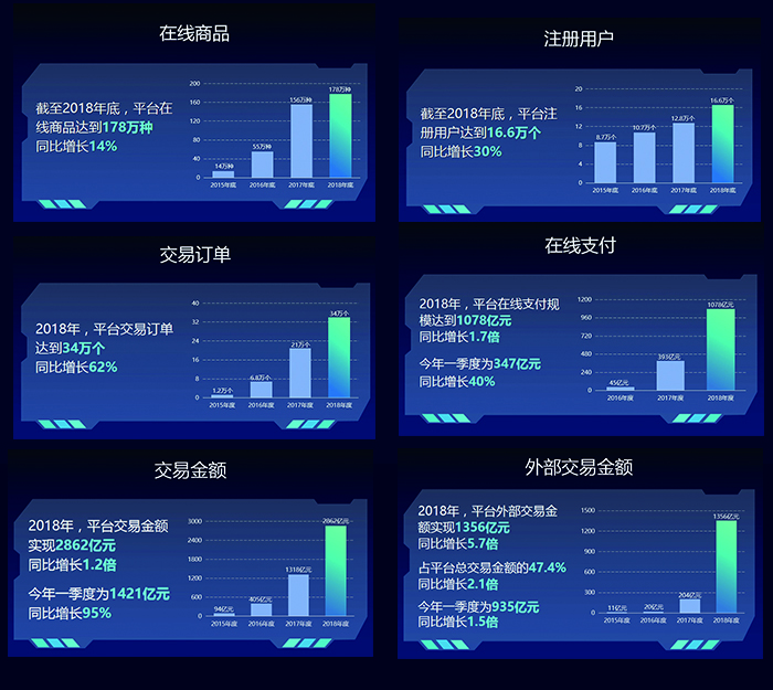 根据公司官网数据显示: 截至2018年底,平台累计上线商品401万种、上架单品5030万个、注册用户超16.6万个、交易金额4835亿元。其中, 2018年交易金额2862亿元,超前几年交易量总和。日均交易金额11.3亿元,同比增长117%;外部市场服务规模1356亿元,同比增长5.7倍;在线支付1078亿元,同比增长174%;自2018年3月商业保理公司成立以来,提供商业保理融资服务29亿元。2019年一季度,平台交易金额1421亿元,同比增长95%;外部市场服务规模935亿元,同比增长153%;在线支付347亿元,同比增长40%;提供商业保理融资服务24亿元。