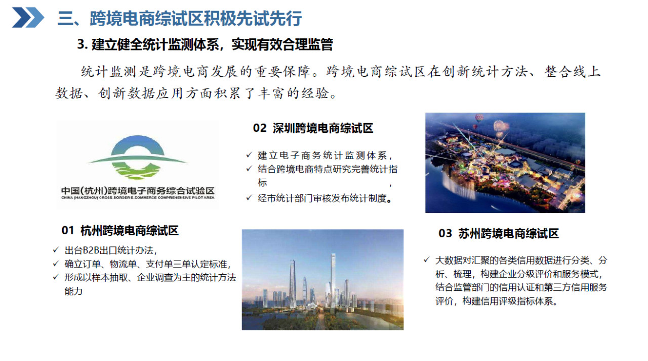1.跨境电子商务交易总额不断增长,结构优化升级;2. 跨境电子商务国内区域发展逐步均衡,中西部地区成为新增长点;3. 跨境电子商务国际范围不断扩大,丝路电商成为新亮点。