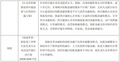 陕西和甘肃分别出台了《关于积极推进供应链创新与应用的实施意见》、《关于积极推进供应链创新与应用的实施》,文件中提到鼓励商业银行、供应链核心企业等建立供应链金融服务平台,或开发兼具标准化和个性化的供应链融资产品,可供应链上下游中小微企业提供高效便捷的融资渠道。