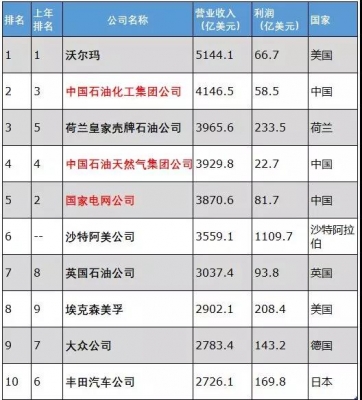 世界500强前10强企业中, 中国公司占据3席,是上榜前十强最多的国家 。中国入榜前十强的企业中,中石化、中石油基于过去一年油价的震荡回暖,排名双双超越了国家电网公司。