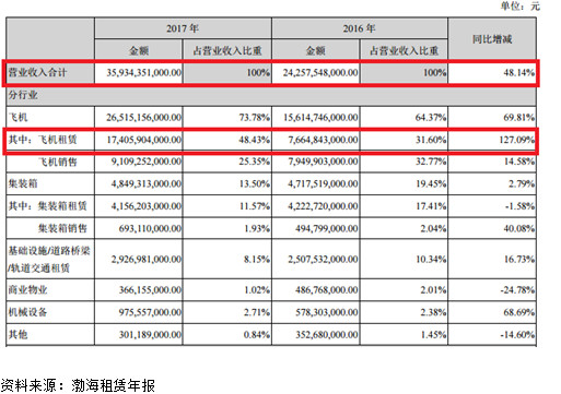 2017 年,渤海租赁的飞机租赁业务收入为174.06亿元,较上年增长127.09%,占营业收入的比重由2016年的31.60%提升至48.43%。