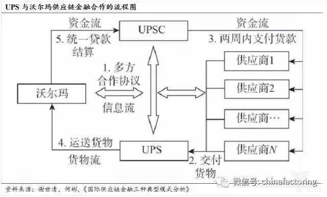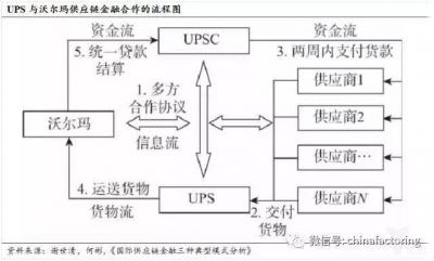 以 UPS 与沃尔玛的供应链金融合作为例, UPS 首先与沃尔玛和其供应商签订多方合作协议,为后两者提供物流服务。同时, UPS 作为中间结算商,代替沃尔玛与东南亚地区数以万计的出口商进行支付结算。而 UPSC 则作为 UPS 的信用部门,保证在货物交付到 UPS 物流机构两周内把货款先行支付给出口商,以确保后者资金的快速运转。出口企业将包括出口清关在内的全程货运业务转交 UPS ,并支付相应的物流服务费用和一定的融资费用。最后, UPSC 代表持有货物的 UPS 与沃尔玛进行统一贷款结算。