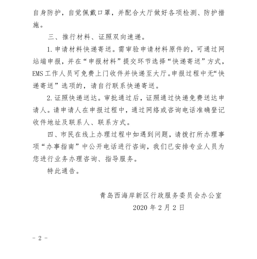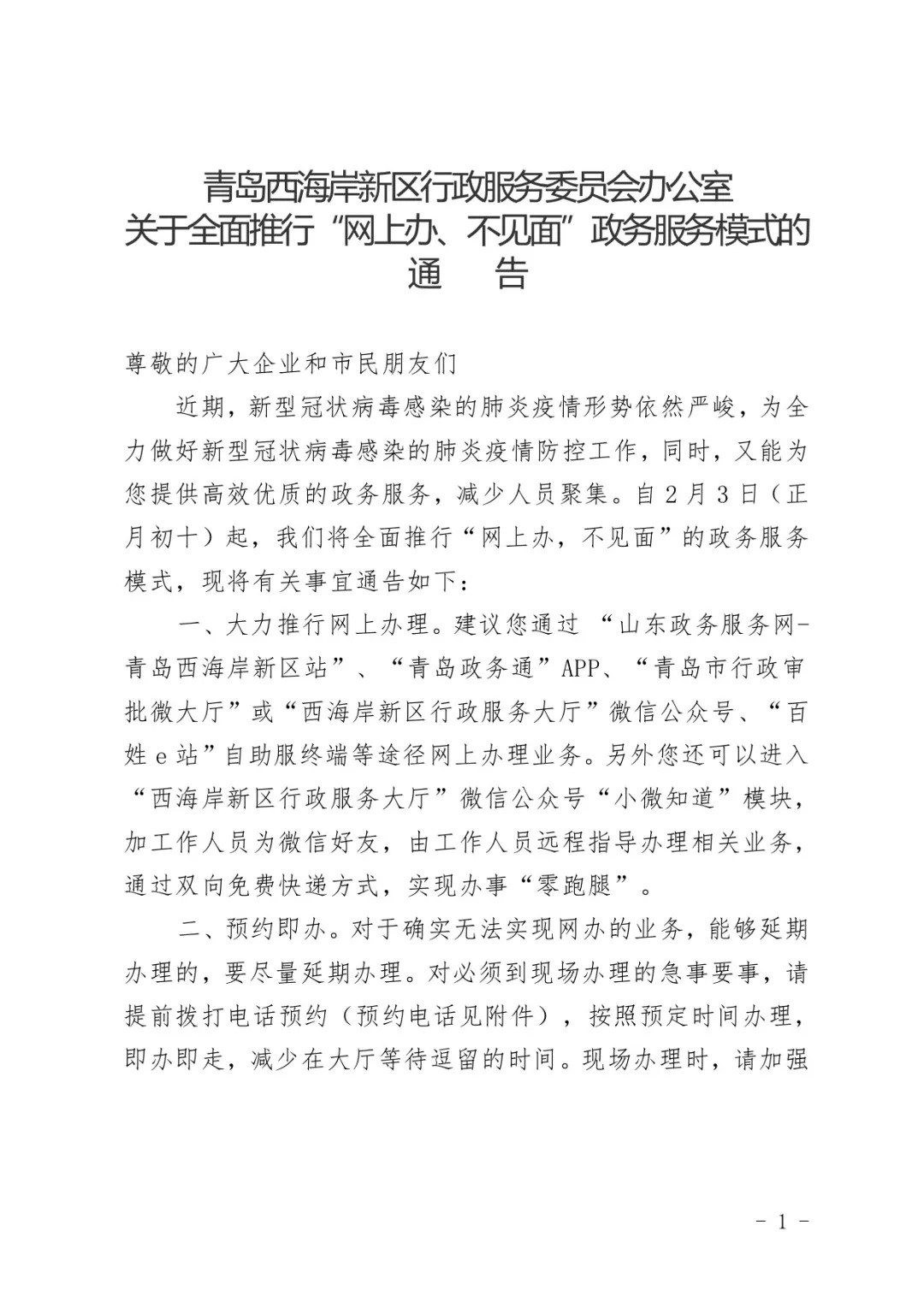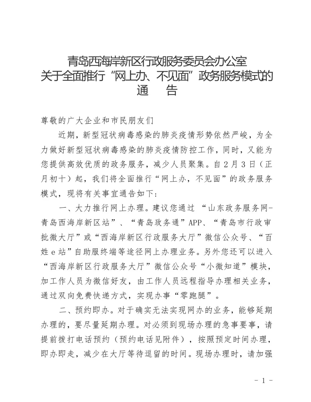 关于全面推行“网上办、不见面”政务服务模式的通告