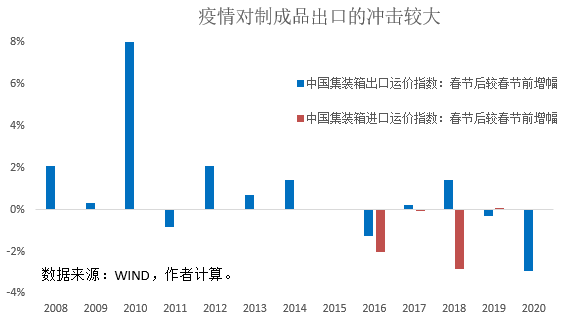 尤其是2020年的出口运价指数变化,已经考虑到了推迟复工因素(延长的休息日期间不再发布运价指数),因此2020年数据和其他年份具有可比性。