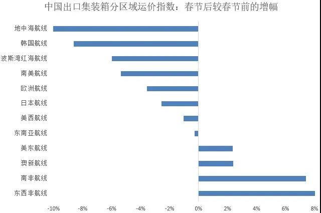 日本航线(2.5%)、欧洲航线(-3.6%)、南美航线(-5.4%)、波斯湾红海航线(-6.0%),韩国航线(-8.5%)、地中海航线(-10.1%)。