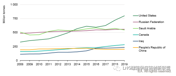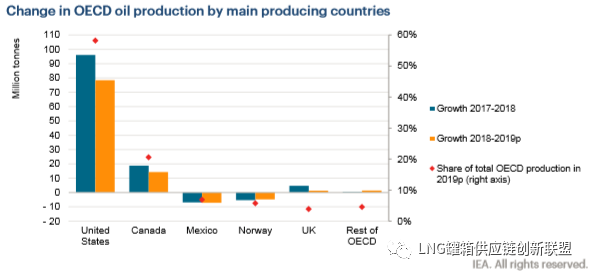 在经合组织的其他国家, 由于新的液化天然气项目增加了冷凝液和天然气凝析液的产量, 澳大利亚的产量增加(同比增长17%), 英国的产量增加(同比增长2.5%), 北海地区的产量在2019年继续保持强劲增长。