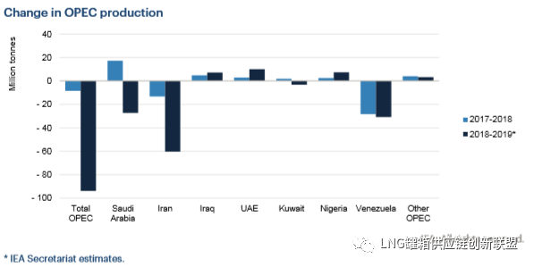 除经合组织国家之外,2019年1月欧佩克和一些非欧佩克成员国决定减产后, 欧佩克的产量下降了5.3%。2019年9月石油设施遭受袭击后, 沙特产量进一步受到干扰, 大幅减产(-4.8%)。损失 更严重的是伊朗(-29%, 原因是受到制裁), 以及委内瑞拉的损失(-36%, 原因是政治和经济动荡)。这些损失足以抵消伊拉克(增产3.2%)、阿拉伯联合酋长国(增产5.6%)、尼日利亚(增产7.7%)和利比亚(增产12.7%)的强劲增长。