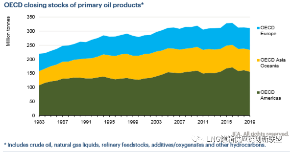 在2019年底, 经合组织的主要石油产品期末库存为311百万吨, 相比2018年底下降了0.7%。总库存量是由经合组织美洲占主导, 库存达156吨, 同比下降3.2%, 主要是在墨西哥(-1.5百万吨)和美国(-4.0百万吨)。
