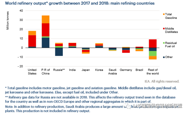 在非经合组织国家,2018年炼油产量向高附加值项目的转变是明显的, 与2017年相比,镏分油 产量大幅增长3100万吨, 其中天然气/柴油(不包括生物燃料)占了75%。