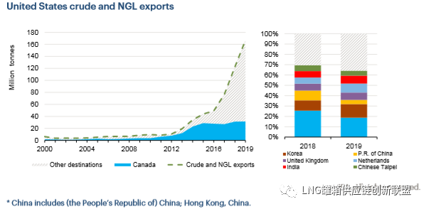 2018年, 美国在全球原油和天然气凝析油中从第10位上升到第6位。根据初步数据,2017年至2018年, 美国原油和天然气凝析油出口增长了60%, 并在2019年继续增长, 尽管增速有所放缓(+36.4%)。这些新销量中的大部分已出口到亚洲市场。特别是2019年, 美国对韩国和印度的出口同比分别增长了80%和66%;尽管如此, 美国对中国的出口下降了42%, 其中一部分被中国台北占据。尽管加拿大在2019年的出口量仅略有增长, 但它仍然是美国原油和天然气凝析油的最大出口来源国。