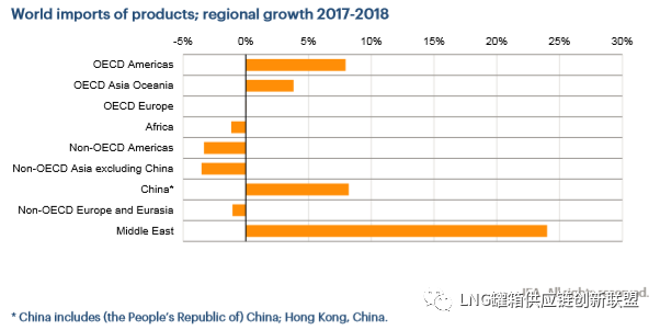 与2017年相比,2018年非经合组织国家的原油和 天然气凝析油进口增长依然强劲, 主要受亚洲(除中国外)强劲增长(+2.1%)、美洲(+2.1%)和非洲(+3.4%)的推动。与此相反, 经合组织的原油和天然气凝析油进口下降了2.3%, 所有地区都出现了类似的回落。