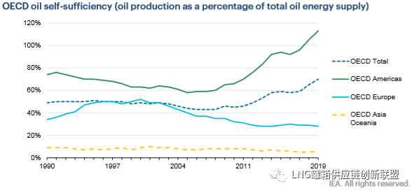 2019年, 受到美国和加拿大石油产量强劲增长的影响, 经合组织美洲地区石油自给能力增强, 推动经合组织石油自给能力有所提高。特别是美国在一年的时间里从国内供应自给量占到85%的产量上升到96%。因此, 该地区在2019年继续实现自给自足。与2018年相比, 经合组织亚洲、大洋洲和欧洲进口依赖地区自给自足水平保持相对稳定。