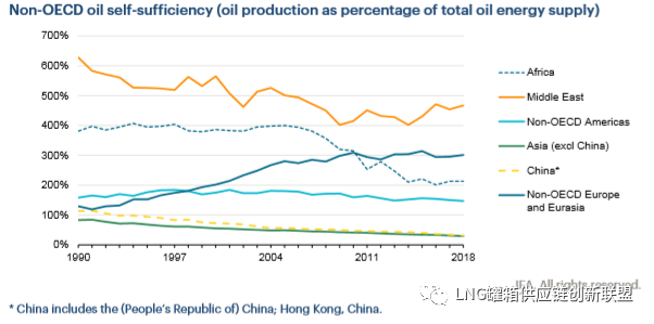 尽管2018年中东地区的石油自给率有所提高, 经合组织以外地区的石油自给率略有下降, 主要原因是亚洲(尤其是中国)的石油自给率下降。