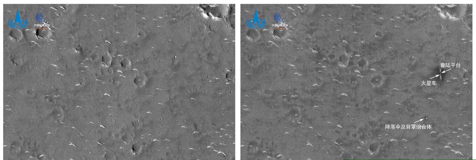 我国首次火星探测天问一号任务着陆区域高分影像图(左图为着陆前,右图为着陆后)