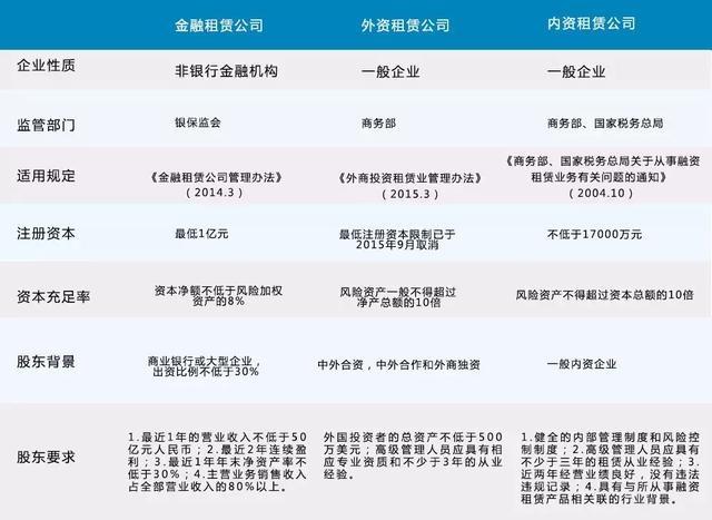 根据监管机构不同的分类,融资租赁企业可分为金融租赁企业、内资租赁企业和外资租赁企业。其中,金融租赁企业属于金融机构,受银保监会监管;而内资租赁企业和外资租赁企业(含中外合资、中外合作、外商独资等)目前仍定位为非金融机构,前者由商务部和国家税务总局及其授权机构审批设立,后者由商务部审批和监管。三类融资租赁企业的监管要求有所不同。