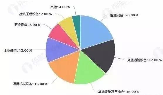 4 、不同类型的融资租赁企业业务投向来看。非金融租赁企业租赁资产总额排名前五位的行业分别是能源设备、交通运输设备、基础设施及不动产、通用机械设备和工业装备,资产规模均超过千亿元(如图5所示),前五大行业合计资产规模占全行业资产规模的81%。而对于金融租赁企业的行业投向,根据零壹融资租赁研究中心发布的对于32家金融租赁公司2016年行业投向统计,大型设备、车辆与轨道交通、医疗、航运航空等领域均有50%以上的企业涉足,另外,能源、基础设施等公用事业、绿色环保、工程机械等也是金融租赁企业投向的行业。从两个不同的统计口径来看,非金融租赁企业和融资租赁企业的业务投向无显著差异。