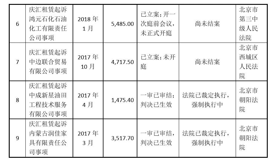 记者注意到,庆汇租赁在资产管理能力方面存在不少问题。宝德股份在2018年第三季度的报告中显示,庆汇租赁存在部分诉讼及强制执行事项共有8起,其中有7起是庆汇租赁作为起诉方,涉案金额达10.07亿元,约是宝德股份2017年营业收入的1.40倍,2018年前三季度营业收入总和的2.96倍。