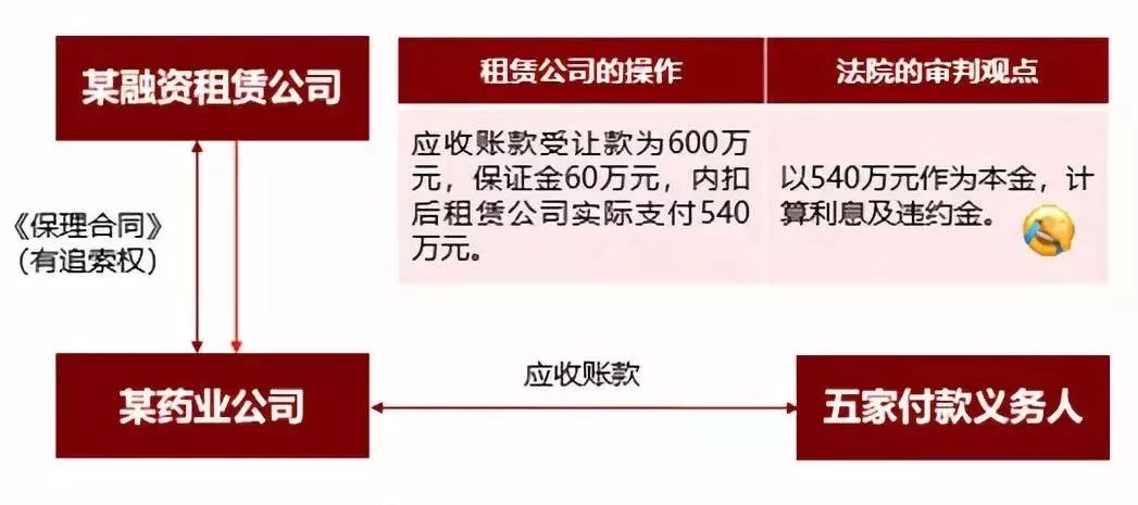 原告某融资租赁公司与某药业有限公司签署《保理合同》(有追索权),约定由某融资租赁公司以6,000,000.00元受让某药业有限公司对其他五家付款义务人享有的应收账款。为减少付款路径,某融资租赁公司在扣除了某药业公司应向某融资租赁公司支付的保证金600,000.00元后,实际向某药业公司支付融资本金5,400,000.00元。《保理合同》另外约定:如发生某融资租赁公司在《保理合同》项下的任何款项未及时足额收回等情况的,某融资租赁公司有权要求某药业有限公司向其一次性就《保理合同》项下已转让给某融资租赁公司的应收账款中未获清偿的部分进行回购,并要求某药业公司按逾期金额日0.08%的标准,支付违约金。后某药业公司在《保理合同》项下发生违约,某融资租赁公司诉诸法院,要求某药业有限公司按照《保理合同》约定履行回购义务,并支付相应违约金。