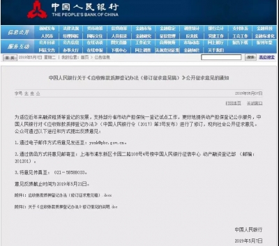 中国人民银行关于《应收账款质押登记办法(修订征求意见稿)》公开征求意见的通知