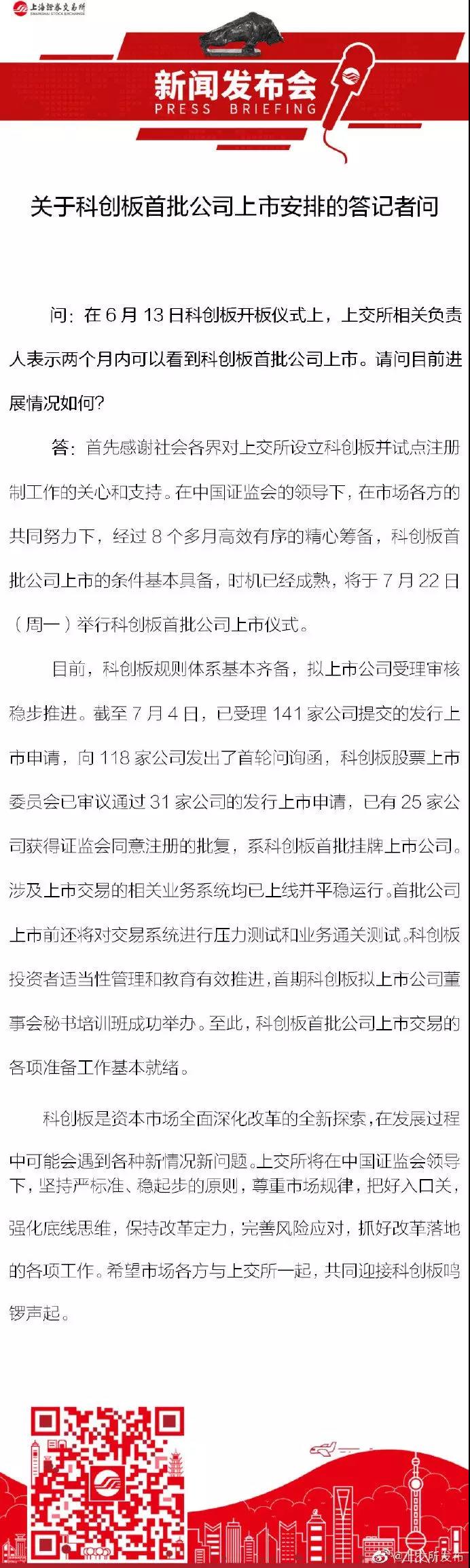上交所相关负责人表示,在中国证监会的领导下,在市场各方的共同努力下,经过8个多月高效有序的精心筹备,科创板首批公司上市的条件基本具备,时机已经成熟,将于7月22日(周一)举行科创板首批公司上市仪式。